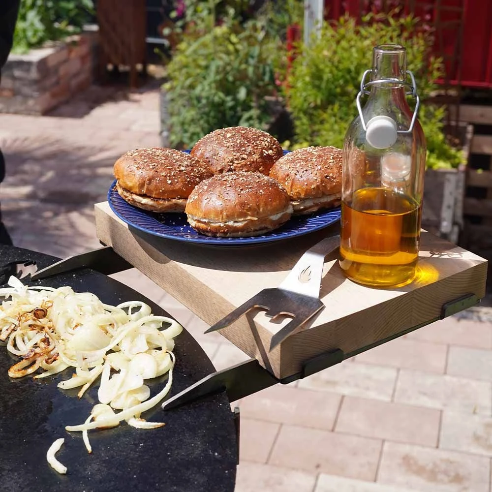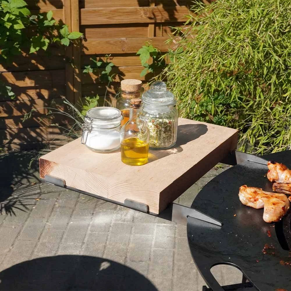 Mit unserem Anstecktisch haben Sie eine direkte Abstellfläche an der Feuerplatte. So können Sie direkt an der Feuerplatte ein Getränk oder Grillgut abstellen. Der Anstecktisch aus hochwertigem Edelstahl und einer Abstellfläche aus massivem Buchenholz wird ganz einfach an die Feuerplatte angesteckt. Geeignet ist unser Anstecktisch für Feuerplatten ab einem Durchmesser von Ø 80 cm und kann bis zu 1 kg belastet werden.