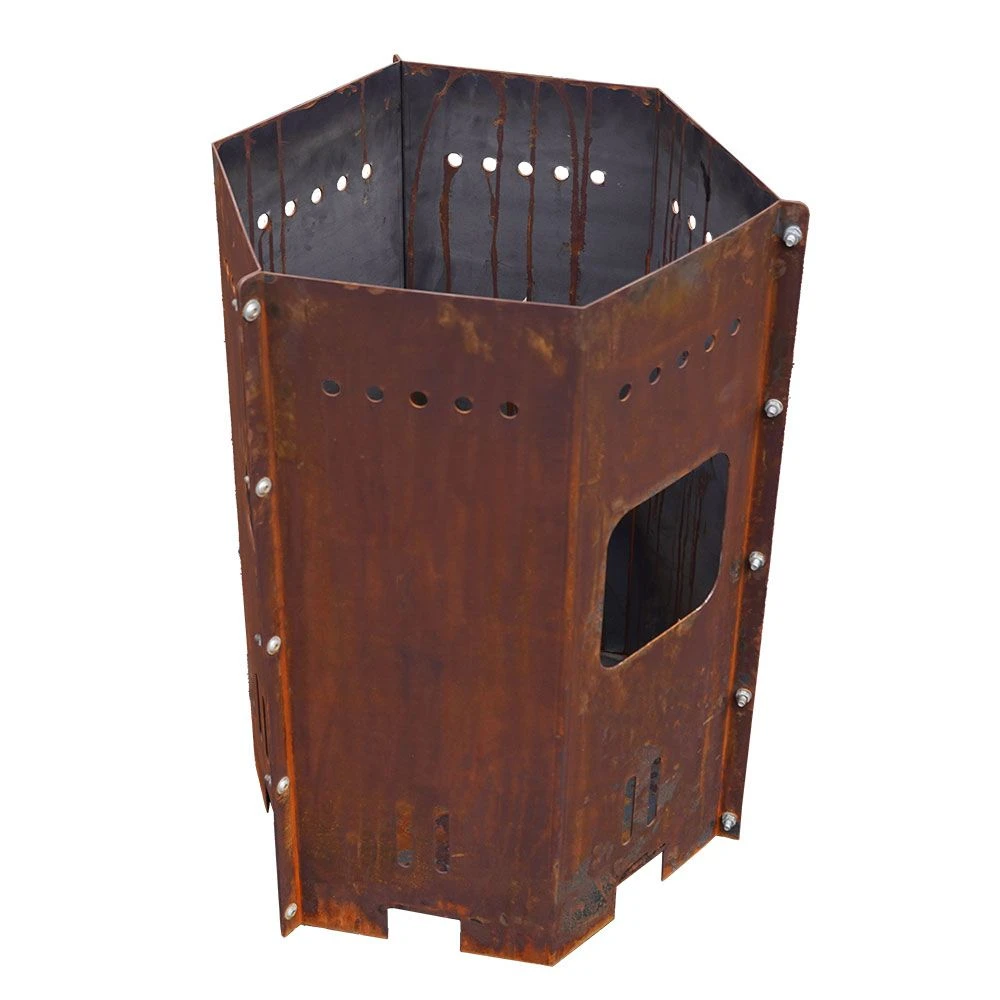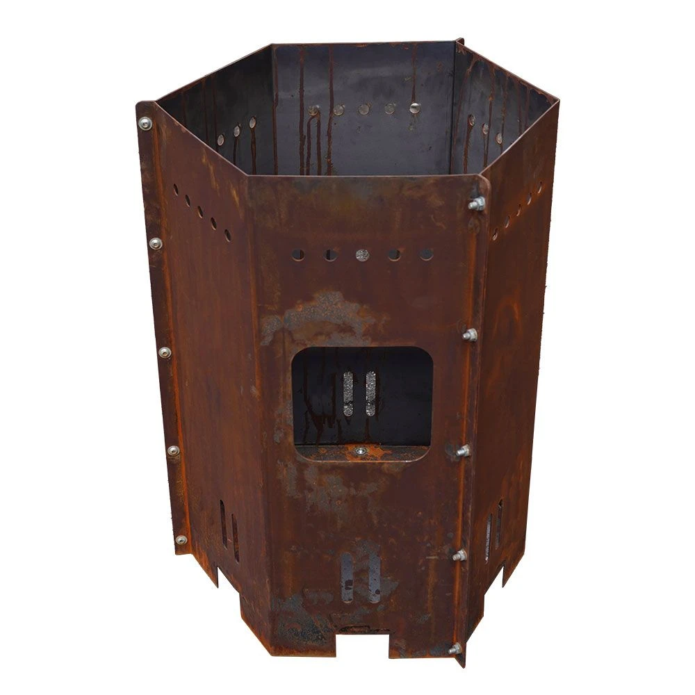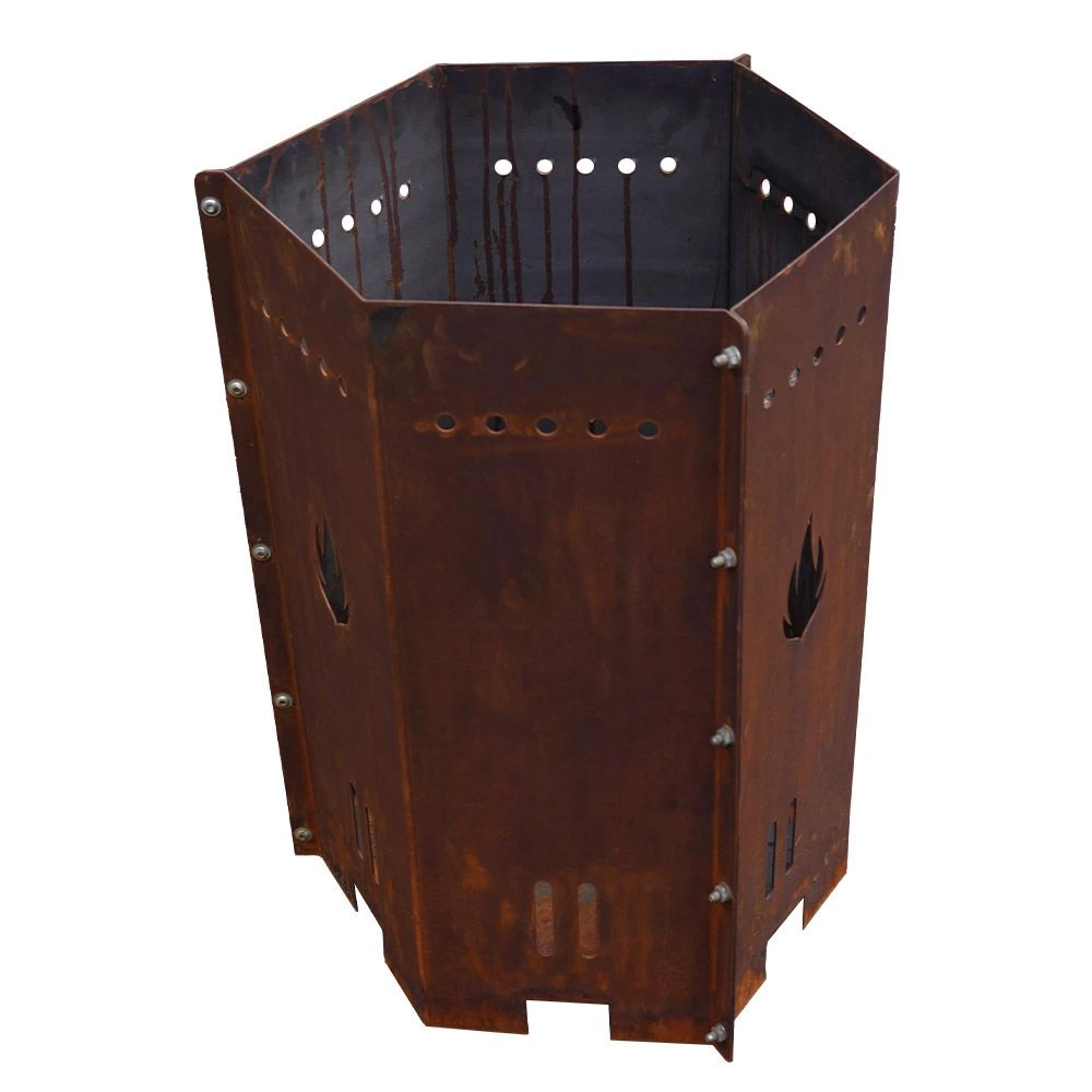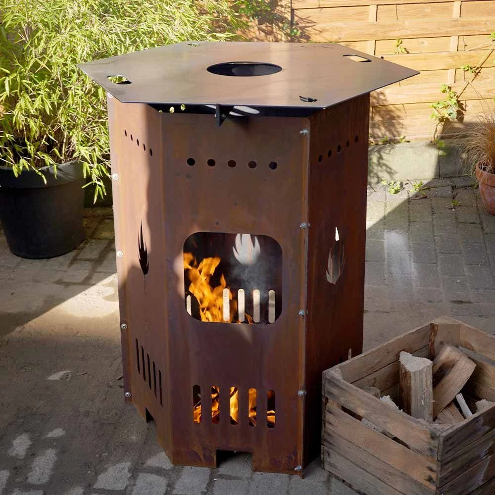 Unsere Feuertonne im 6-eckigen Format ist das Must-have für jeden BBQ Fan! Sie kommt im stylischen Edelrostlook daher und ist ein absoluter Blickfang. Unsere Grilltonne hat eine seitliche Öffnung, durch die Sie sicher und einfach Holz nachlegen können. Als weiteres Highlight sind verschiedene Aussparungen zur optimalen Luftzirkulation integriert. Dank der idealen Höhe von 100 cm können Sie darauf ganz bequem viele verschiedene Speisen zubereiten. Bitte beachten Sie, dass passende Feuerplatten Ø98 cm oder Ø80 cm und Feuerplattenhalterungen separat bei uns erhältlich sind.