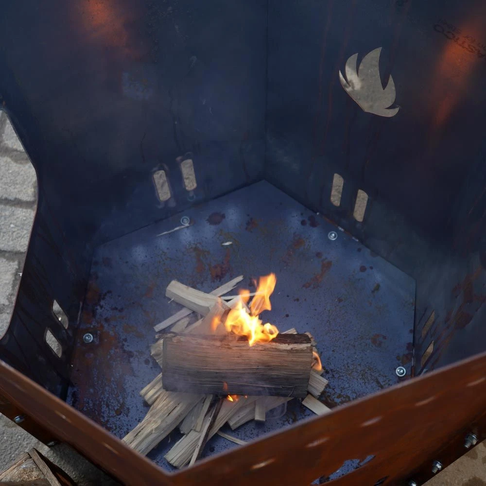 Unsere Feuertonne im 6-eckigen Format ist das Must-have für jeden BBQ Fan! Sie kommt im stylischen Edelrostlook daher und ist ein absoluter Blickfang. Unsere Grilltonne hat eine seitliche Öffnung wodurch Sie sicher und einfach Holz nachlegen können. Als weiteres Highlight sind verschiedene Aussparungen zur optimalen Luftzirkulation integriert. Dank der idealen Höhe von 75 cm, können Sie darauf ganz bequem viele verschiedene Speisen zubereiten. Bitte beachten Sie, dass passende Feuerplatten Ø 60cm und Feuerplattenhalterungen separat bei uns erhältlich sind.