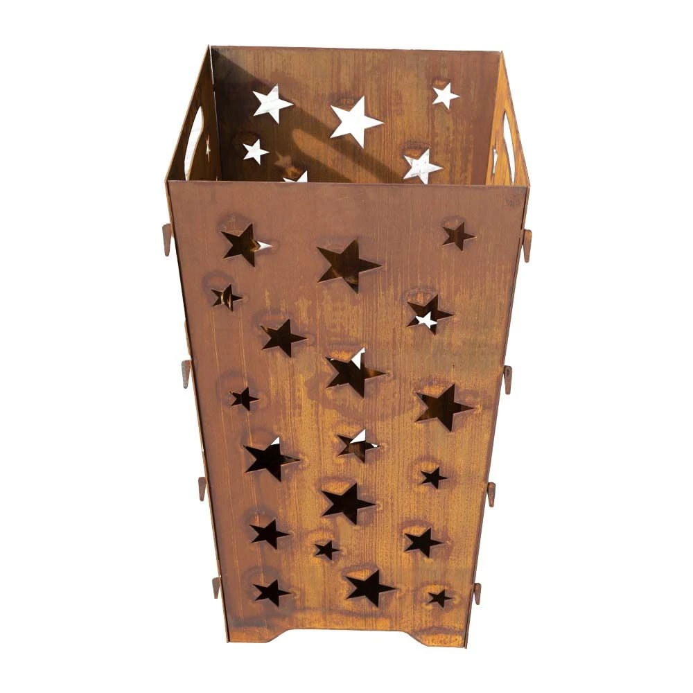 Unsere Feuertonne Stars ist das Must-have für den Garten oder die Terrasse! Sie kommt im stylischen Edelrostlook daher und ist ein absoluter Blickfang. Durch den unkomplizierten Aufbau ohne Werkzeug ist sie schnell zusammengesteckt und einsatzbereit. Dank der Griffe lässt sie sich mühelos platzieren.