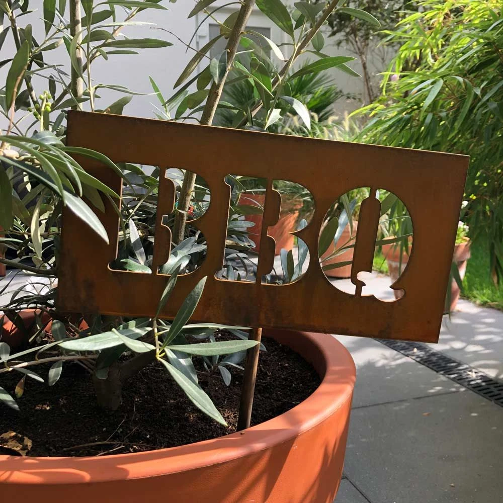 Unser Gartenschild „BBQ“ mit Stecker in Edelrostoptik passt auf jede Terrasse, Balkon oder Garten. Verschönern Sie Ihr Zuhause mit unserer stilvollen Gartendekoration. Gefertigt aus 1,5-2mm Cortenstahl in Rostoptik. Der Hingucker für Garten und Terrasse. Bitte beachten Sie, dass jede Dekoration ein individuelles Rostmuster hat und farblich von der Abbildung in unserem Shop abweichen kann.