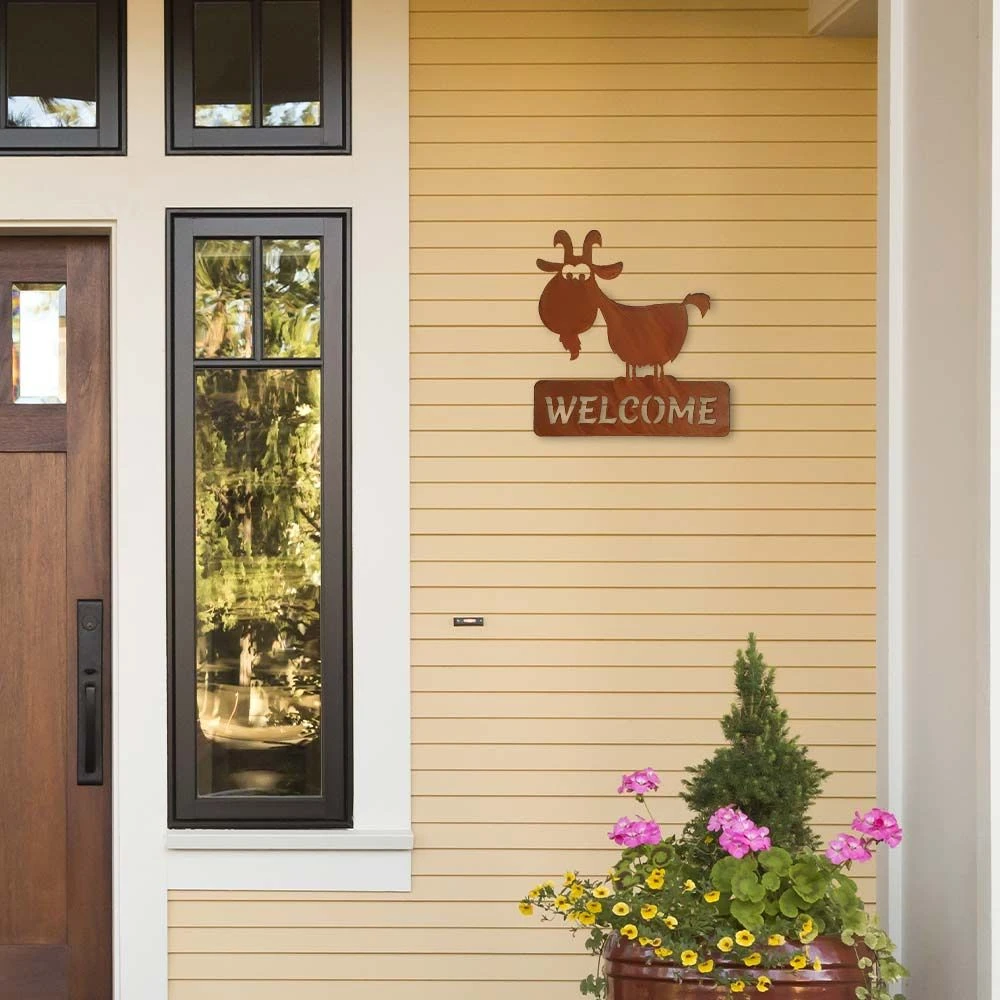 Mit der Edelrost Ziege mit Schild setzen Sie Highlights in Garten, Terrasse oder in Ihrem Heim. Schilder in Rostoptik sind die ideale Ergänzung für Ihre dekorative Gestaltung. Bitte beachten Sie, dass jede Dekoration ein individuelles Rostmuster hat und farblich von der Abbildung in unserem Shop abweichen kann.