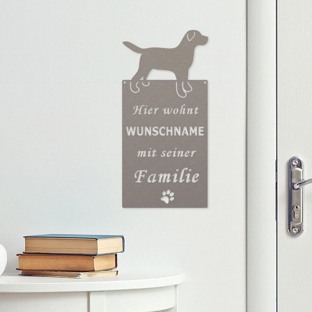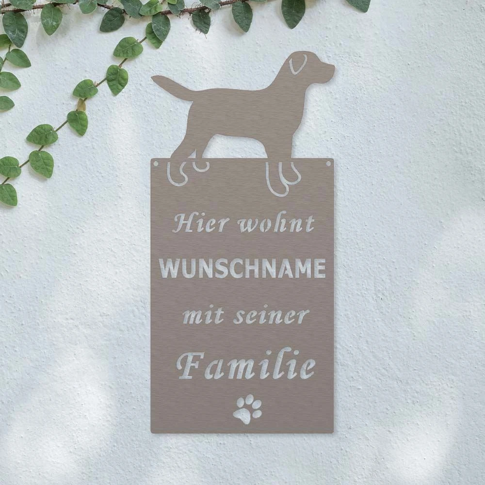 Unser Edelstahl-Schild mit dem Namen Ihres Hundes kann durch Aufhängen an einen Nagel an der Wand befestigt oder an die Wand geschraubt werden. Der Hingucker für Ihre Eingangstür, den Garten oder die Terrasse.