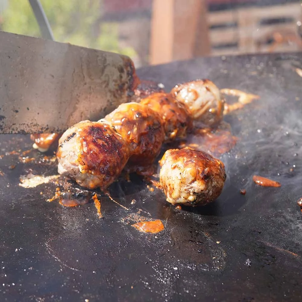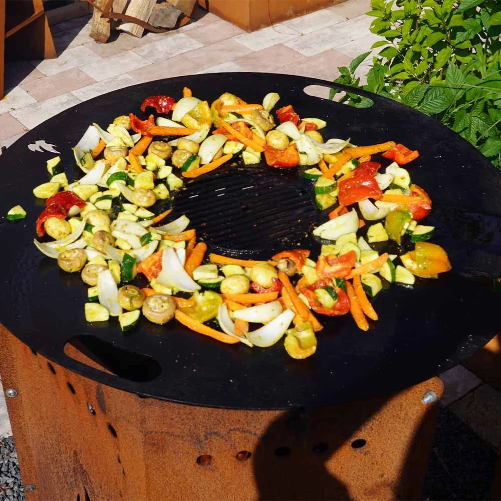 Mit einer Feuerplatte erleben Sie und Ihre Gäste ein besonderes Grill-Feeling, denn hier grillt jeder mit. Von Gemüse über Fleisch, Würstchen und sogar kleine Fladenbrote lässt sich nahezu jedes Grillgut auf ihr zubereiten. Der große Vorteil eines Grillrings liegt an den unterschiedlichen Temperaturzonen. Während sich der innere Ring für das scharfe Anbraten und Grillen mit hohen Temperaturen eignet, wird fertiges Grillfleisch zum Warmhalten an den Außenring gelegt. Zu Beginn des Grillens geben Sie ein wenig Raps- oder Sonnenblumenöl auf die Fläche und legen das Grillgut auf. Dies ist wichtig, damit sich es sich gut von der Platte lösen lässt.