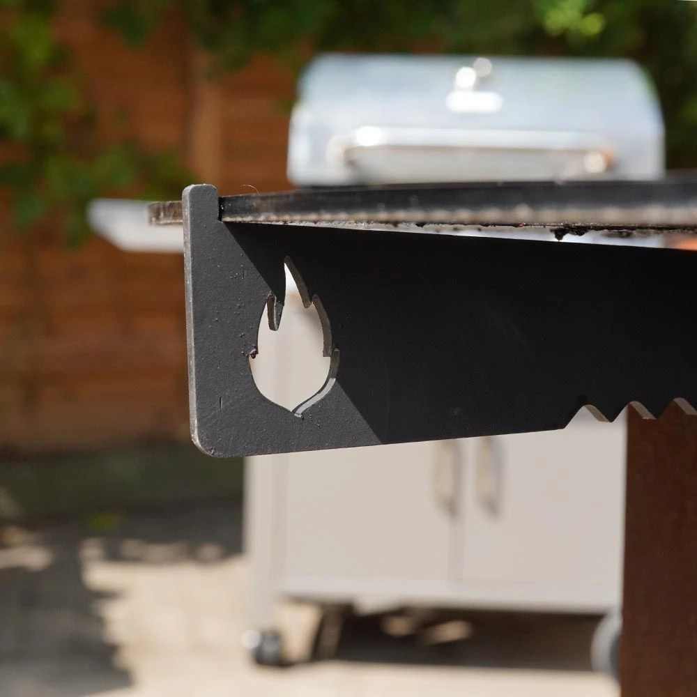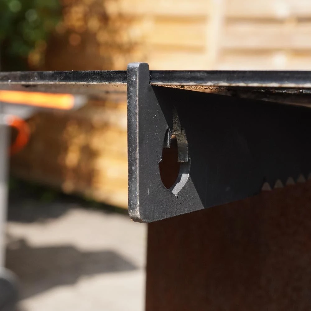 Grillen auf der Feuertonne? – Mit der Halterung für die Feuerplatte wird das zum Kinderspiel. Die Halterung sorgt dafür, dass die Feuerplatte sicher und stabil auf der Feuertonne liegt.