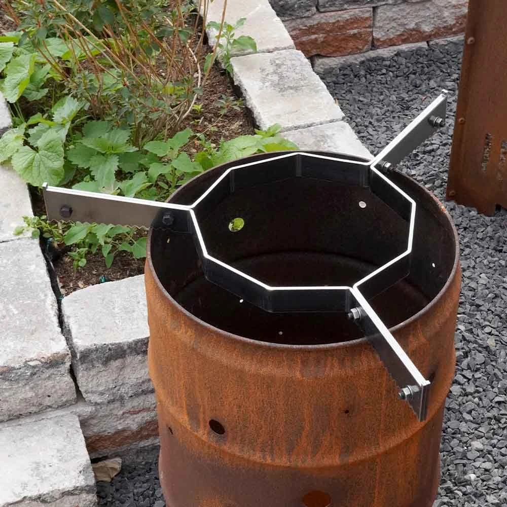 Grillen auf der Feuertonne? – Mit der Halterung für die Feuerplatte wird das zum Kinderspiel. Die Halterung sorgt dafür, dass die Feuerplatte sicher und stabil auf der Feuertonne liegt.