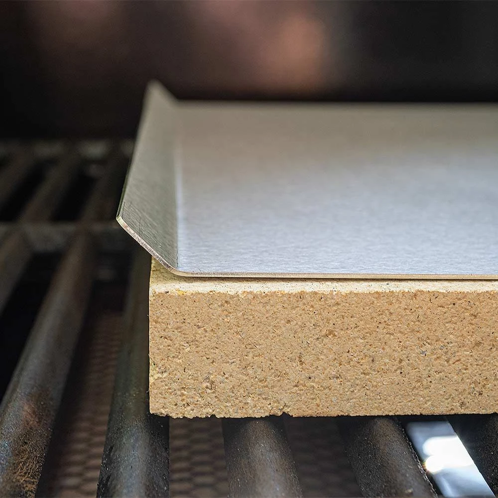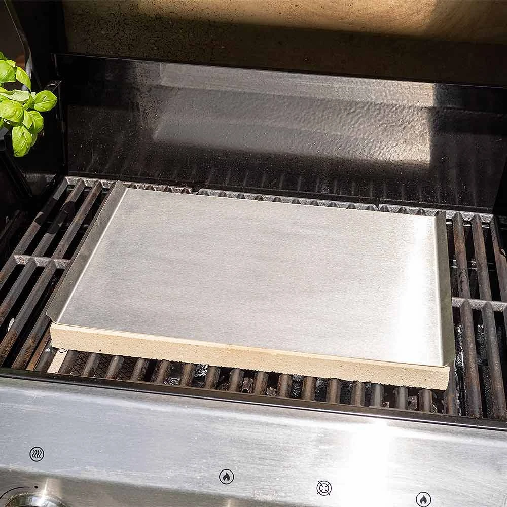 Der Pizzastein aus hochwertiger, lebensmittelechter Schamotte in der Größe 40 x 30 cm hat einen Stärke von 3 cm. Zur Benutzung wird der Pizzastein einfach auf das Grillrost gelegt und ca. 20-30 Minuten aufgeheizt. Danach ist der Pizzastein einsatzbereit. Zusätzlich erhalten Sie ein schönes & praktisches Edelstahlblech auf dem Sie auch Fleisch, Gemüse, etc. zubereiten können.